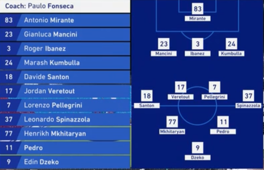 排兵布阵方面,罗马前场三叉戟哲科、佩德罗、姆希塔良搭档。