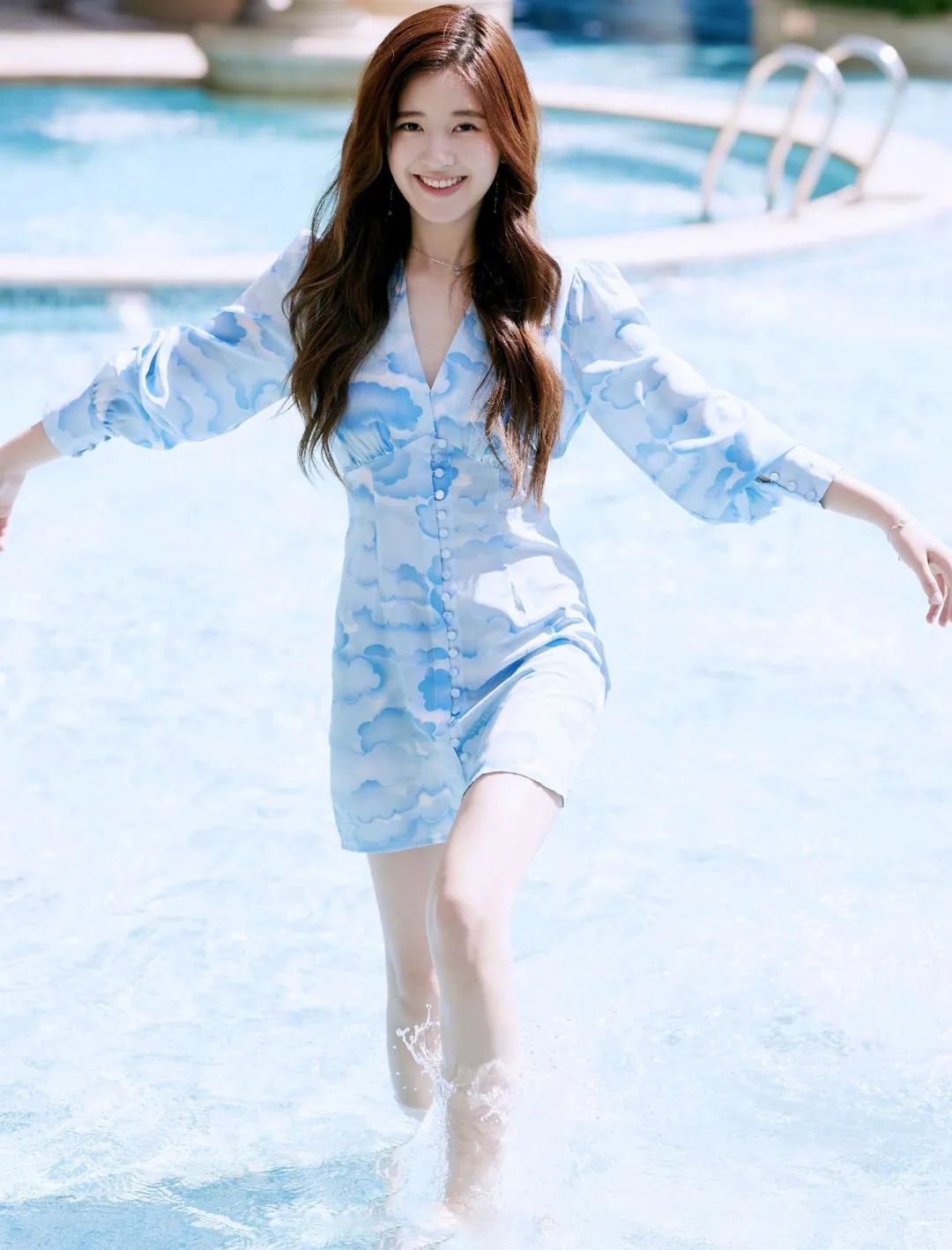 一袭蓝天白云连衣裙,清纯甜美的气息扑面而来,甜妹儿的标准笑脸,如沐春风,秒杀所有。