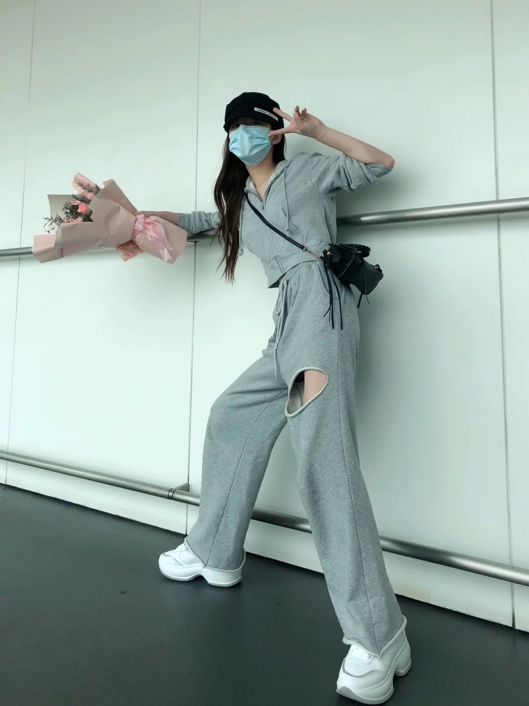 灰色运动套装同样没有掩盖住她身上特有的少女感,破洞设计似乎是青春期少年的标配,青春总是带点叛逆的。