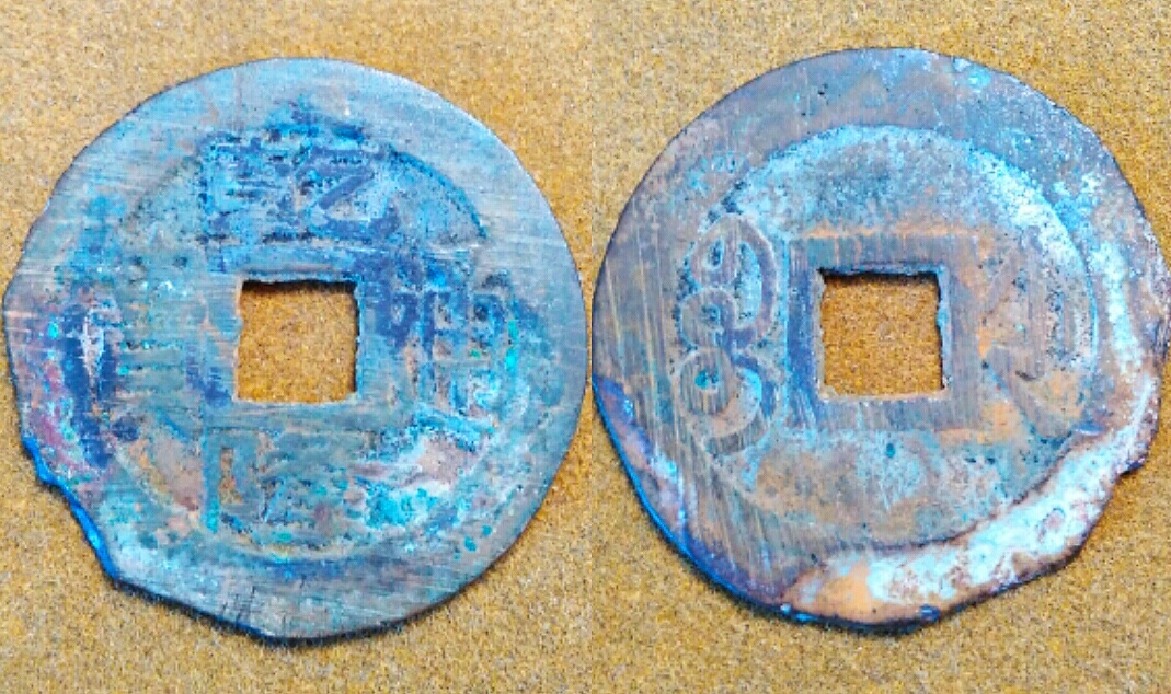1、关于“乾”字(图1币、下同)。币中“乾”字左旁上部疑缺半横,由常见的“十”变为“卜”,这是什么原因?“乾”字是否存在这样的异书?在唐朝铸钱“乾元重宝”中,“乾”字的左旁和图1币是一样的,但其右旁为“竖弯钩”,而非“乞”,遍查字典和古籍,未见图1中的书写形式;那是否为铸后遭物理性的损伤而缺失半横呢?经放大后,“可能的”字根连接处,并没有见到断面痕迹(见图5):
