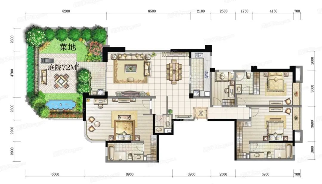 8栋住宅楼的天墙垂直绿化和天井的三维绿化,总计27200平方米;社区的总绿化面积为33,900平方米。