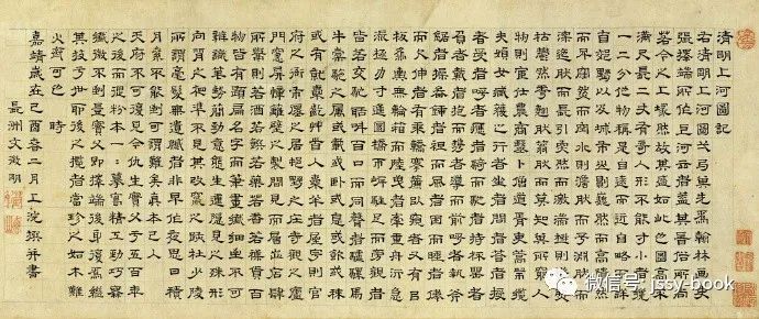文徵明隶书作品欣赏《清明上河图记》,嘉靖二十八年已酉(1549)二月,长洲文衡山八十岁隶书题跋清明上河图仇英摹本,台湾故宫博物院藏。