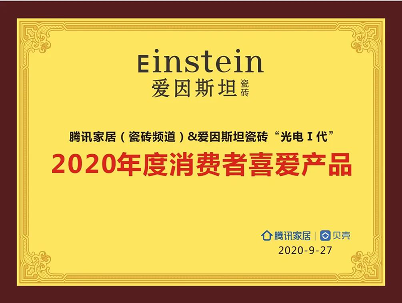 此外,爱因斯坦瓷砖“光电系列”产品凭借不凡的实力,一举斩获,由腾讯家居频道、贝壳装修网联合颁发的“2020年度消费者喜爱产品”证书。这一证书的获得,证明了爱因斯坦瓷砖产品的再次创新升级的成功,更体现了爱因斯坦瓷砖致力于高品质家居空间的坚定信念。