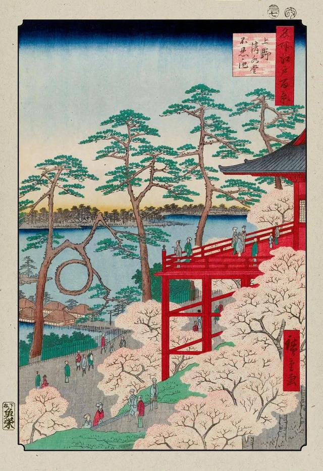 广重的这幅画作采用了俯瞰的视角,樱花环抱的清水堂、月之松和不忍池,在这种视角下,呈现出了极强的纵深感。