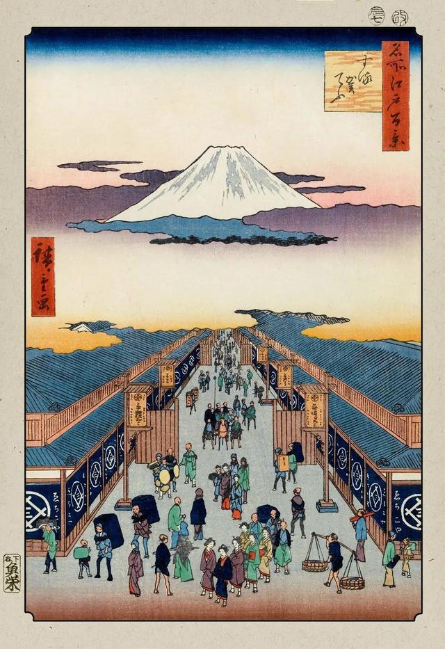 画面中央拥挤的桥建于1603年,即著名的“日本桥”,自1605以来,它一直是官方测量全国所有距离的点。