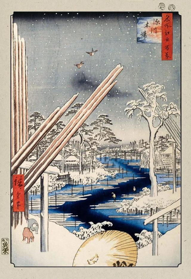 也许因为大雪的关系,广重笔下的木厂被没有日常的喧闹忙碌景象,而是人烟稀少,略有萧条,只有零星的两个工人在劳作。