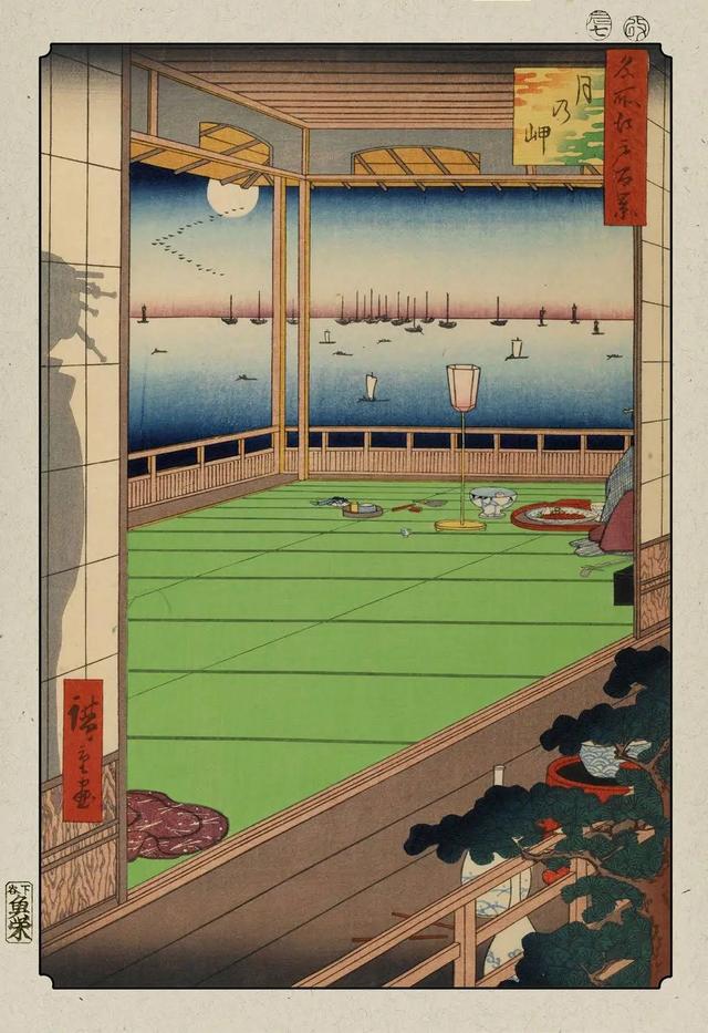 秋天的天空中的月亮大而明亮,江户湾并没有因为夜幕的降临变得萧条,仍然承载着各种小船帆,看起来不失忙碌,鸟群在天空和水面之间飞过,更为背景增添了几分动感。