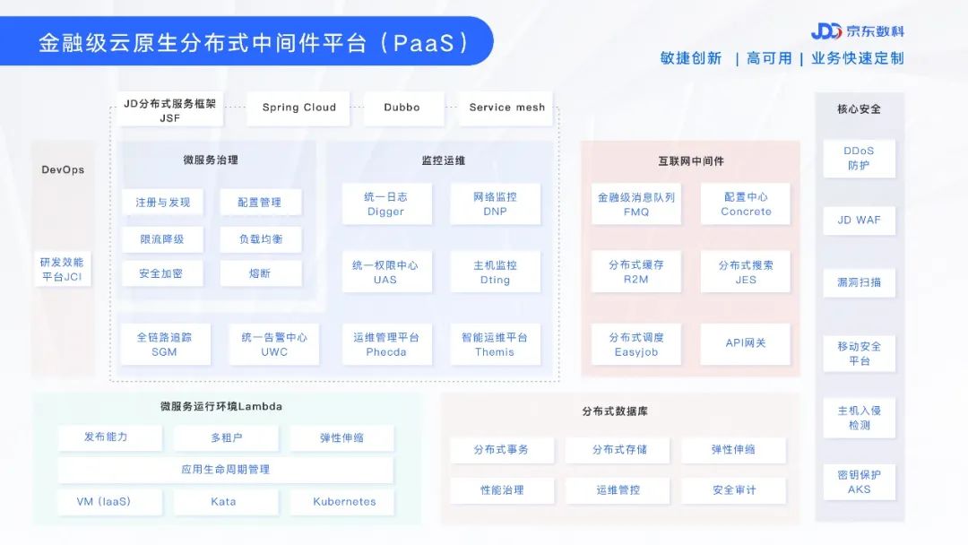 京东数科金融级分布式中间件平台(PaaS)旨在帮助金融机构搭建基于分布式架构的技术中台,在保障高可用、满足异地容灾、低成本快速扩容等需求的同时,助力业务开发从“稳态”到“敏态”、从开放到生态,适应快速变化的客户需求。具体包含分布式微服务开发框架、双模资源管理、分布式中间件、研发效能和监控一体化等能力。