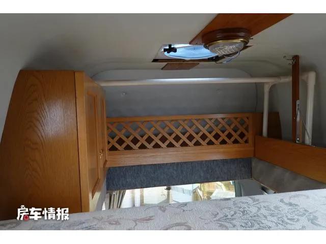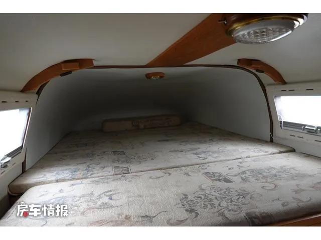 从车内可以进入顶部的睡眠区域,是一张尺寸约为1900*1800mm的双人床,也是这辆车唯一的睡眠区域,垂直高度也很不错,不会很压抑,顶部有换气扇、顶灯以及储物区域,两侧还有外推窗,可以为这里提供光照和通风,躺在这里野夜晚还可以看星空的美景,非常惬意。