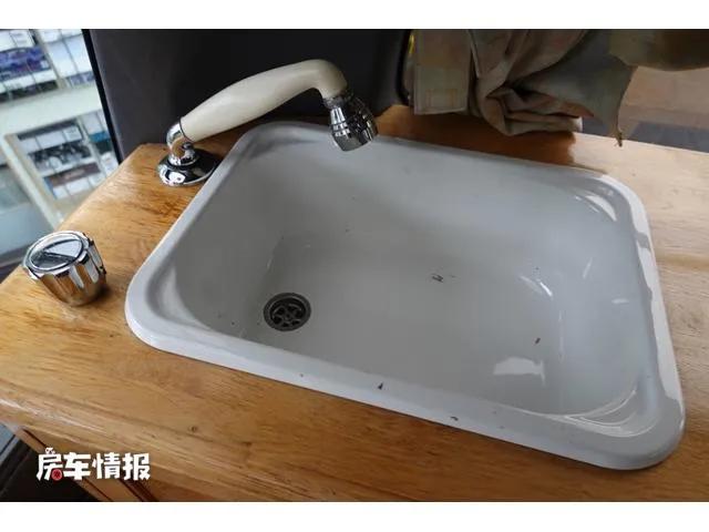 厨房在车内左侧,是一个大的木质柜子,上面有一个陶瓷洗手池,旁边还有空间很大的操作台,下面有很多大小不一的储物柜和抽屉,可以存放很多厨具和出行时所需的食物。只需要携带一个便携式卡炉就可以做饭炒菜了,不过建议您在户外炒菜,因为车内空间毕竟有限,油烟容易污染到车内的环境。