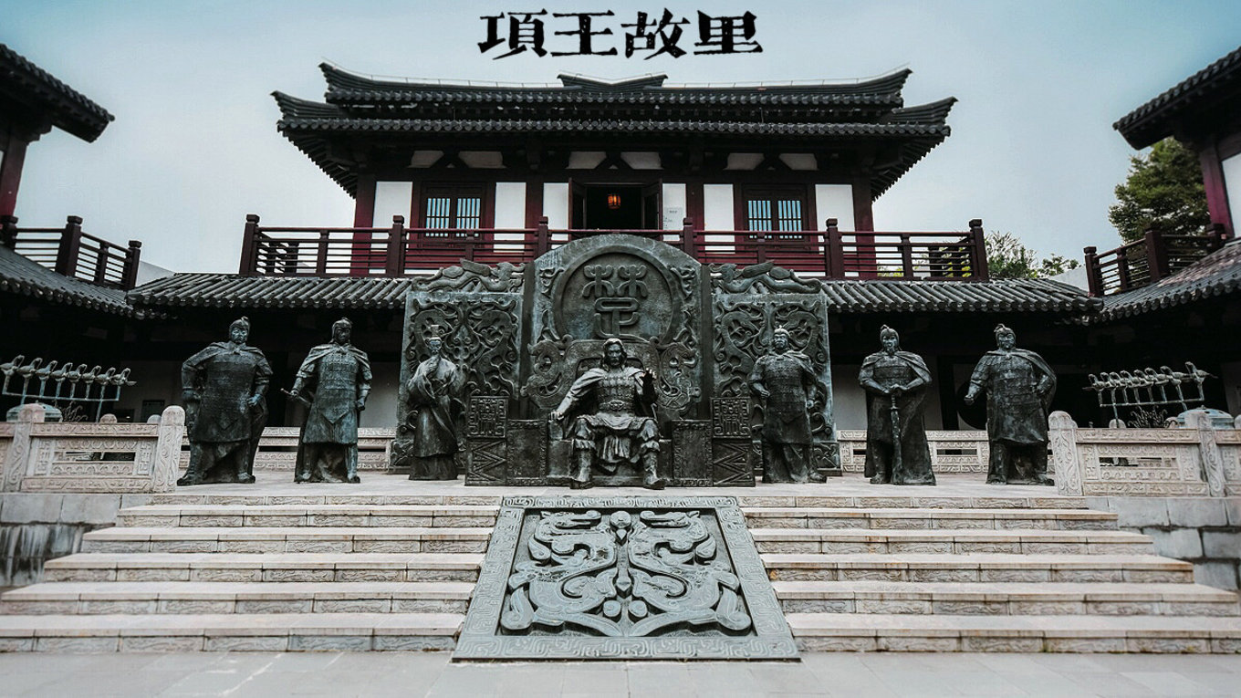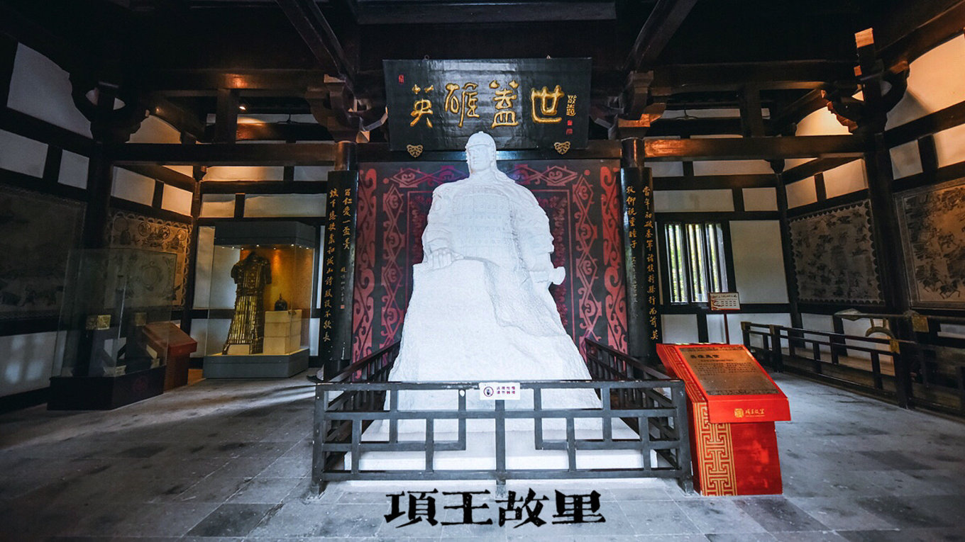 景区主体建筑为三进院落,前为高大的汉式石阙,象征项羽故居为帝王规格。中院以英风阁为主体,阁内为项羽高大塑像。