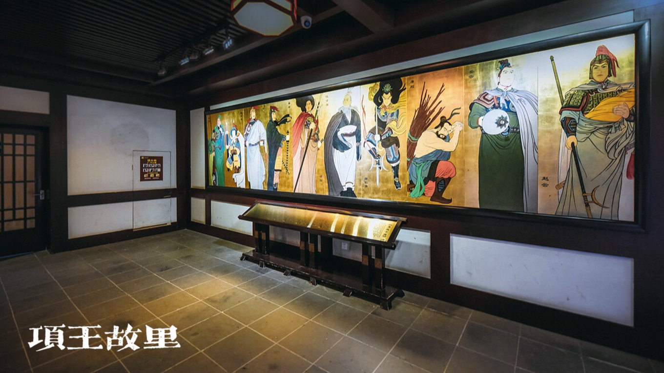四面墙上嵌着反映项羽生平十二幅浮雕,如项羽举鼎、吴中起兵、破釜沉舟、 巨鹿 救赵、鸿门设宴、垓下突围等。