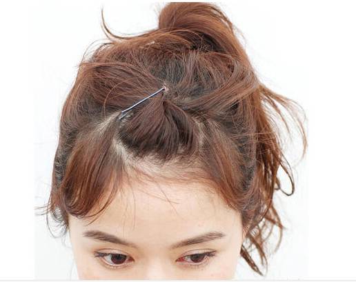 再把刘海向后扭转用黑色发卡固定。