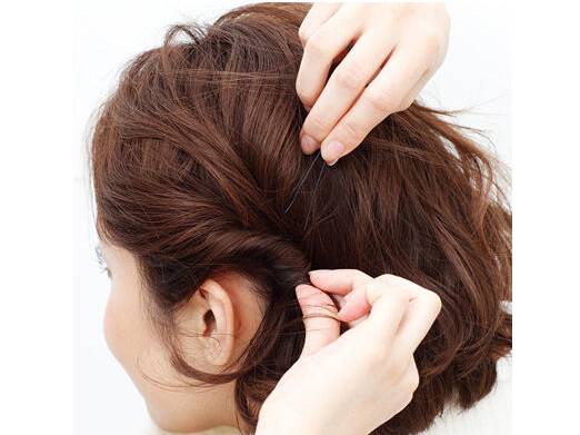 然后再侧边取一小束头发向后扭转,再用发卡固定发束。