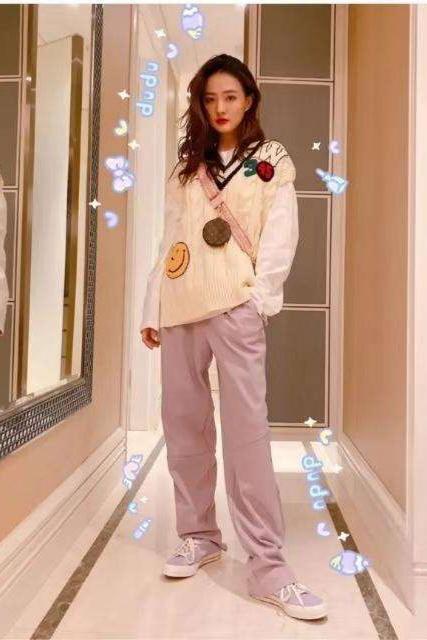 这一套是比较好看的,超级适合学生党穿搭。这种的穿搭是比较显小的,也比较有气质。这样的搭配在学校妥妥的校花,因为真的太好看了。白色T恤搭配针织毛衣是比较可爱的,这款毛衣背心v领设计、领口有黑色条纹设计,衣服上的图案设计比较可爱。紫色的长裤是拖地版型的,超级显瘦。