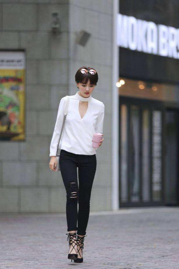 这套穿搭超级性感的,时尚又简约。徐璐的身材也太好了吧,这套穿搭真的超级显身材,比较适合身材好的姐妹哦。白色的上衣比较简单,但是胸口的v领设计,超级有设计感。黑色紧身裤有破洞设计,超级nice。黑色高跟鞋的绑带也太棒了吧,真的超级好看。这样的搭配比较简单,但是时尚感满满,爱了爱了。