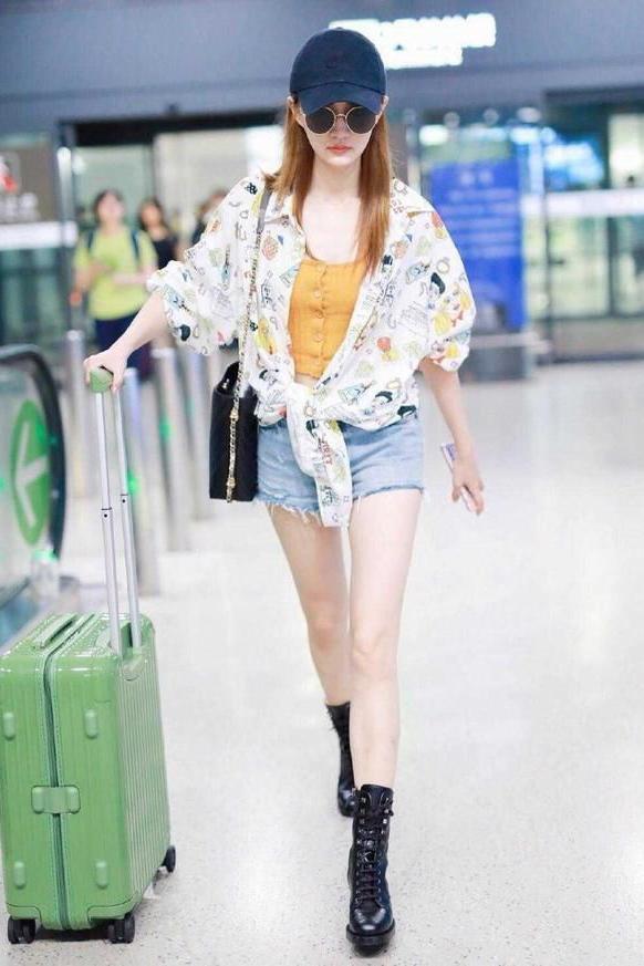 这套穿搭是机场穿搭图,比较性感。这套穿搭有bm风格的衣服,bm风格的衣服都是超级考验身材的。橙色的内搭,圆v设计,超级显身材。衬衣中袖有许多可爱的涂鸦,打结的设计是比较显年轻的。牛仔超短裤的穿搭,真的超级显身材。马丁靴和墨镜、帽子的搭配,真的超级有气质,超级帅气。