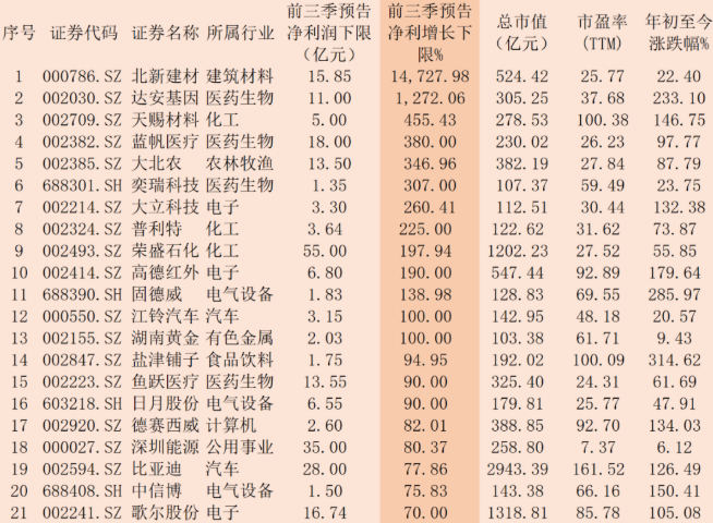 目前沪深两市有近700家公司公布了三季报业绩预告。通过以下限制条件简单跑了一个数据:市值大于100亿,三季报净利润大于1亿元,业绩预增下限在30%以上。这样的限定主要是为了剔除一些业绩波动巨大的小盘垃圾股。