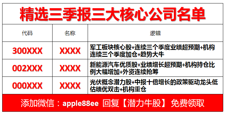 想获得这一份名单的朋友,可以添加微信:apple88ee 回复【潜力牛股】,免费领取这份名单,数量有限,先到先得!