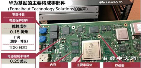 对基站不可缺少的电源进行控制的半导体也是美国德州仪器(TI)和安森美半导体(ON Semiconductor)等的产品。此外,华为的基站还使用美国赛普拉斯半导体(Cypress Semiconductor )的存储器、美国博通(Broadcom)的通信开关部件、美国亚德诺半导体(Analog Devices)的放大部件,基板电路使用的电子零部件中有德州仪器的产品。