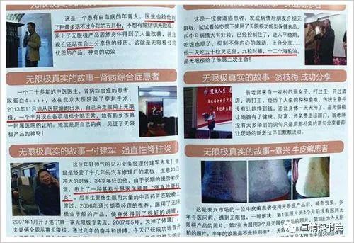 在澎湃新闻曝光的一份名为《见证无限极——用事实说话》的内部资料中,“白血病、脑瘫、糖尿病、乳腺癌、淋巴癌、红斑狼疮、肺癌、脑溢血、先天性心脏病、强直性脊柱炎、小儿麻痹等疾病患者”,均在使用无限极产品后“见证奇迹”、“获得重生”。[5]