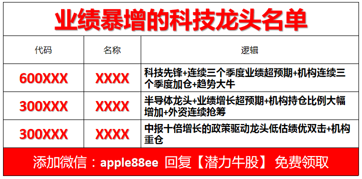 我们综合筛选出三只【业绩暴增的科技股龙头】,投资者朋友们可以加微信:apple88ee 回复【潜力牛股】 免费领取(或者长按识别下方二维码即可领取)