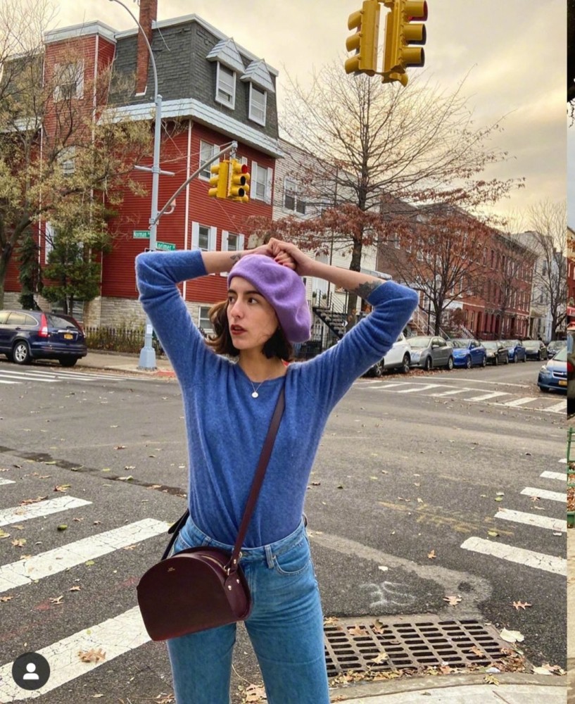 这一身造型整体都是以紫色为基础,紫色的蓓蕾帽搭配同色系的针织衫,性感又迷人,特别的显白有气质,本身针织衫就非常的温柔大方,保暖效果也特别好,搭配上一条简单的牛仔裤,整体的造型就特别的出彩,贝雷帽更是平添几分艺术家的气质,充满了法式的浪漫。