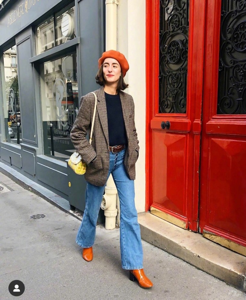 或者是尝试一下现在大热的西装单品,要想走法式元素,格纹西装一定要尝试下,格纹西装本身的质感特别的复古高级,稍加搭配一下整体的造型就特别的有艺术气息,尤其是脚上搭配的这双橙色高跟鞋,特别的有质感,高级又时尚。