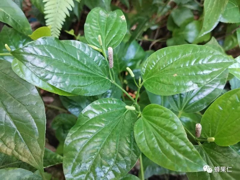 我们先说假蒌吧,它是胡椒科胡椒属的多年生木质草本植物,地上的茎部以倾斜匍匐的方式生长,用手揉捏叶子会散发出微微的辛臭气味。两叶柄中间的经部细小,叶柄处稍大且脆,茎部有细小的纵条纹,每个叶柄处也是根系生长的部位。叶子膜质,单叶对生,表面暗绿发亮,阔卵形或近圆形。腋生花序,小长圆柱状的穗状,秋季十月份开花。果长圆柱形黄白色,果期秋末冬初。生长环境喜欢在阴湿的水沟边或乡村路边生长,既有野生的也有人工栽植的。全草均可药用,四季可采,洗净晒干备用,新鲜的常被采来做菜品配料食用。