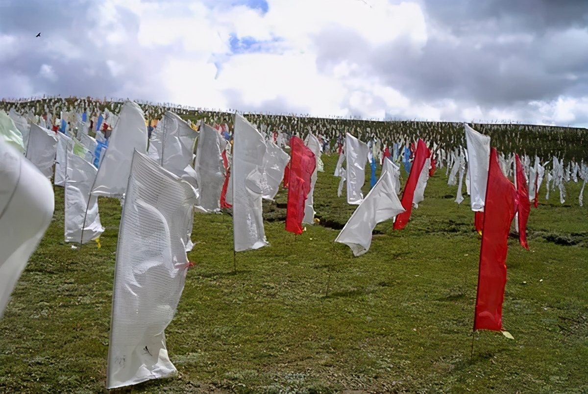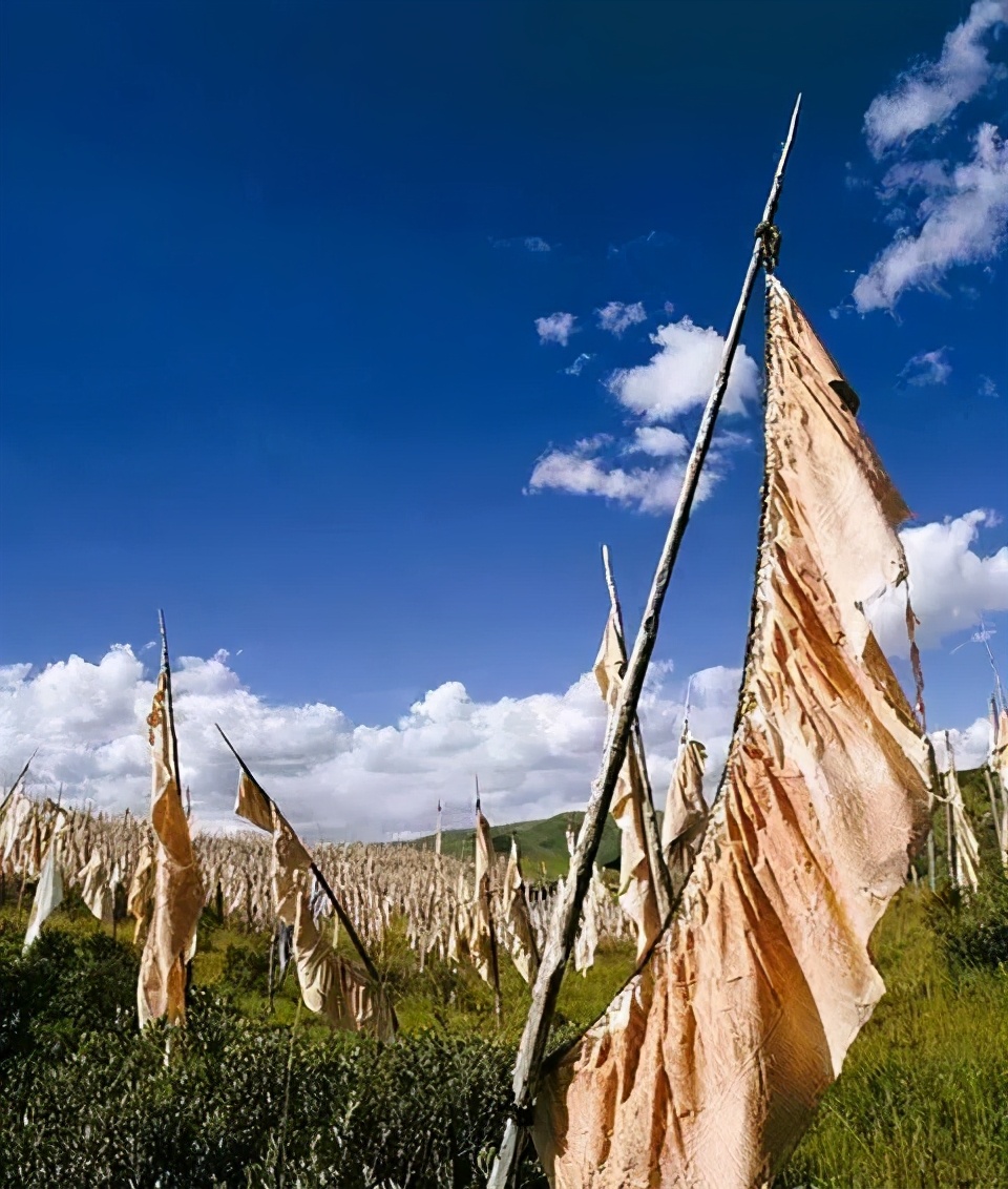 也说“风马”旗的出现是“雍宗”苯教对远古本土原始宗教屠宰上千头的牲畜来祭奠先祖、神灵的血淋淋的牺牲血祭仪礼进行的改造,而代之以模拟化的“风马”旗祭,后来,藏传佛教沿用了这一形式,并成为在藏区随处可见,极为时尚的一种祭祀崇拜形式。