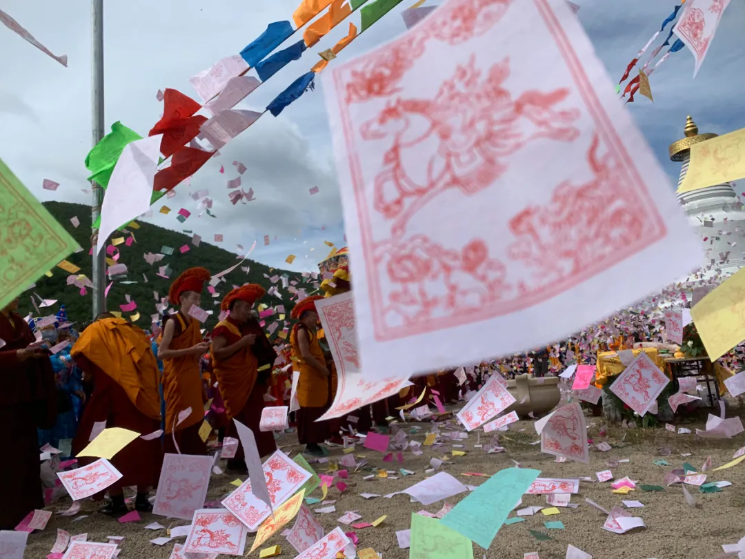 在神秘的雪域西藏高原的神山圣湖、江河桥畔、垭口岩穴、寺院圣殿、宫堡佛塔、玛尼堆石、村寨民居。巨石古树、岸壁隘口,凡认为具有灵气的地方……,你都会见到一种在红、黄、绿、蓝、白五色布上印有一身驮三宝的骏马、陀罗尼咒语、观音六字神咒、佛教经文箴言及各种图纹佛像相间组合而成的“风马”旗、经幡(经旗)。它们或横或竖,或因势插挂,永远随风张扬、猎猎飘动,似乎在永无休止地诵念着“风马”上的经文。当远途跋涉的藏族人翻上每一座山峰或跨过每一座大桥,又都会下马、脱帽,振奋地高呼吉祥颂词,向空中抛撒一种印有宝马驮经的五彩小纸片“风马”,(亦称放“风马”)并煨桑致意,以示向年神(山神)、赞神(天神)、龙神(水神)的敬畏和祭祀。这样的五彩“风马”旗、片和经幡,在藏区可谓无处不有、无处不见。它象道道彩虹装点着圣洁的巍巍雪域净土,象片片五彩雪花撒播着藏民族特有的精神风韵,也向人们展示着高原独特的人文景观。