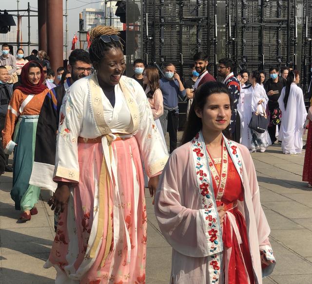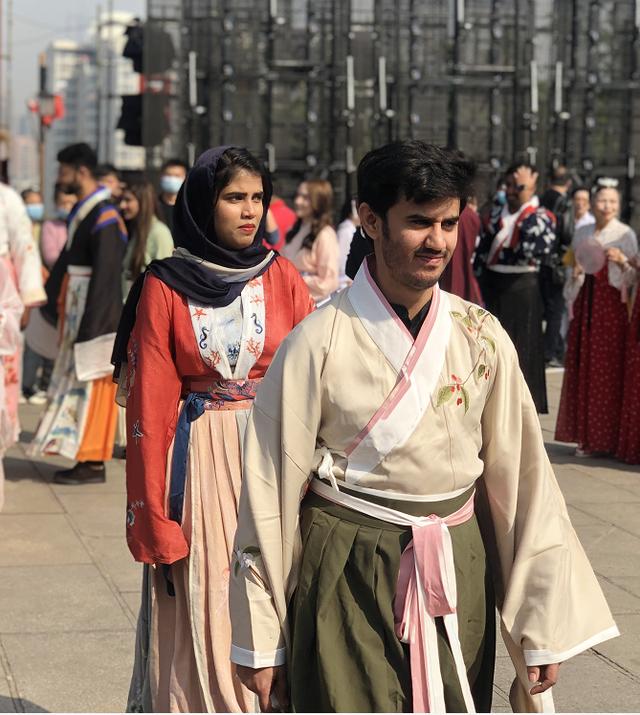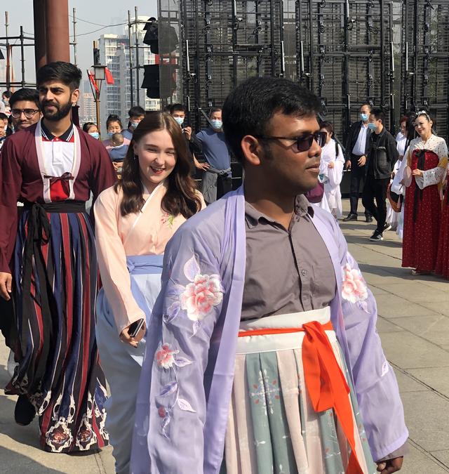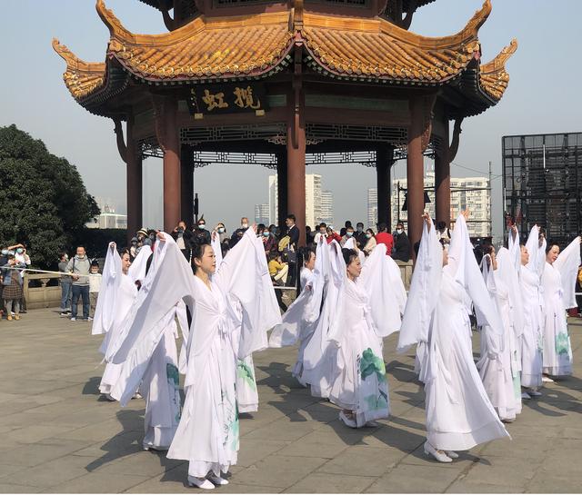 随后而来的是中南民族大学的天仙女子和武汉小学生,他们身着各式华服,与游人共舞,穿梭期间,让人感觉真的梦回三千年,特别武汉纺织大学的外籍留学生,在华服装束的印衬下,以中式棋琴书画为姿势的造型和一招一式,更是让人浮想联翩,他们并不纯正的汉语表达“我爱中国、我爱武汉”将快闪活动推向高潮。