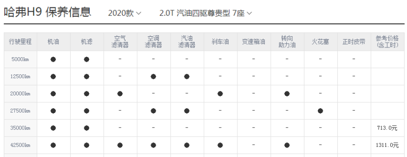 买车是大事儿,对于车主来说,除了前期买车时的大笔投入以外,后期养车成本同样重要。哈弗H9-2020款首保周期为5000km,之后的保养周期为每7500km一循环。给大家举例说明做个参考,其每次基础小保养需更换机油438元、机滤75元,费用为513元,再算上70元工时费,合计单次小保养共计583元。整体来看,哈弗H9-2020款前57500公里预计花费4044元。