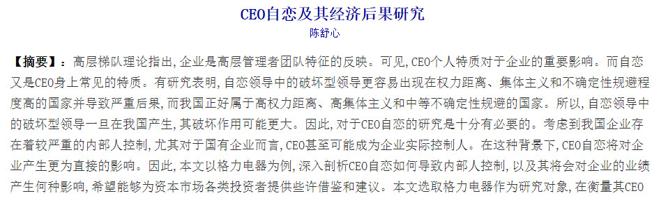 近日,浙江工商大学会计学专业陈舒心的硕士毕业论文《CEO自恋及其经济后果研究——以格力电器为例》引发广泛热议。
