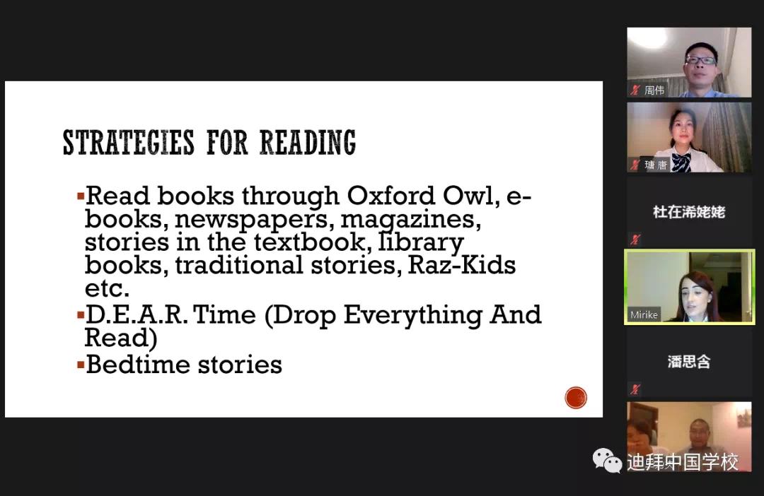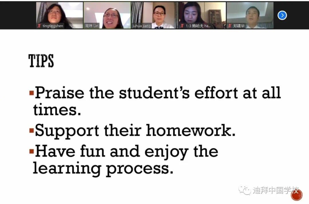 迪拜中国学校以“中国心灵”,“国际视野”,“人文情怀”作为学生的培养目标,学校充分重视美术、音乐、社会道德与法治课的建设,各“综合课”教师创新家长会开展方式,通过案例、视频等形式展现学校“五育”建设。老师们和家长们共议拓展课程,分享特色课程,获得了家长们的广泛好评。