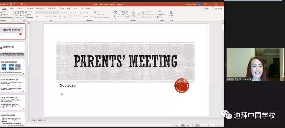 本次期中“云端”家长会是学校成立后第一次全体家长会,意义重大。作为第一批赴海外支教的中国教师,以传播中国教育理念为己任,在学校高位引领和老师们精心准备下,各班级从中国先进育人与教学理念、义务教育课程计划与实施、课堂教学改革与创新等多维度为我们的家长带来一场精神与思维碰撞的盛宴。家长们纷纷感慨:“这真的不是我小时候的中国教育了!”
