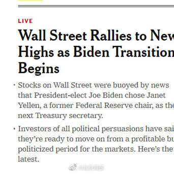 【美股突破30000点大关是谁的功劳?特朗普:我的;美媒:拜登的】昨日,美股道琼斯指数首次突破30000点,创历史新高。得到消息的特朗普马上在白宫临时召开了时长1分07秒的记者会,他表示:这是美股在特朗普政府期间第48次打破纪录,2020年第9次打破纪录。特朗普首先对自己的幕僚表示了祝贺,之后才对美国人民(people of our country)表示祝贺。虽然特朗普把功劳算给了自己,但美国主流媒体普遍认为是“拜登总统过渡期正式开始”(as Biden transition begins)提振了市场信心。《纽约时报》认为,道指新高主要有两个原因:1.美国总务署周一对当选总统拜登表示可以正式开始交接程序;2.拜登将提名前美联储主席耶伦(Janet Yellen)担任财政部长。
