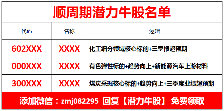 我们结合基本面和技术面综合分析,精选出了出一份《顺周期潜力牛股名单》。投资者朋友们可以加微信:zmj082295 回复【潜力牛股】 免费领取(或者长按识别下方二维码即可领取)