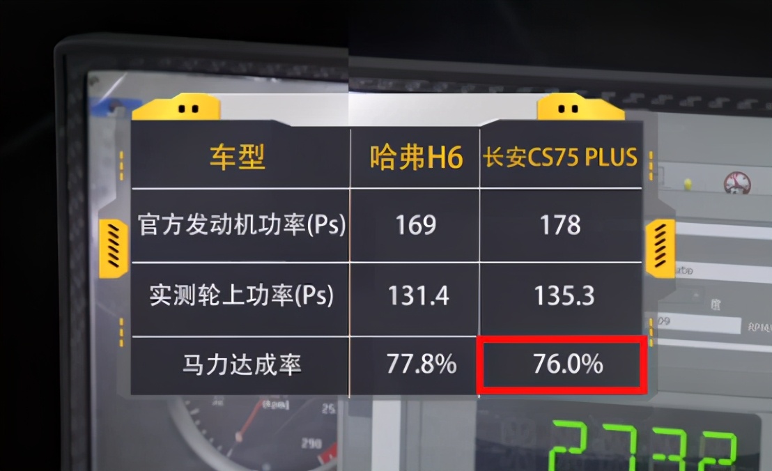 如图所示,长安CS75 PLUS实际轮上马力与额定马力相差超40Ps,最终达成率是76.0%。而第三代哈弗H6相差则仅30Ps左右,马力达成率在77.8%。同时,基于第三代哈弗H6轻量化设计,实际行车中第三代哈弗H6百公里加速需9s左右,长安CS75 PLUS在10s以上,在这一维度的表现事实上对日常行车影响并不是很大,非专业驾驶员无法明显感知差距,但从专业来看,第三代哈弗H6确实更优一些。