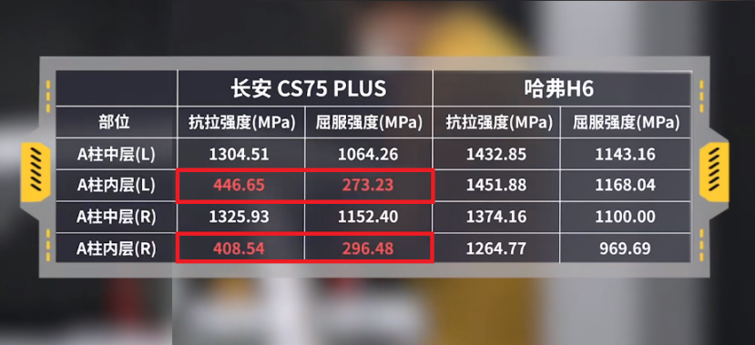 在节目中,长安CS75 PLUS被爆出后防撞梁仅能承重0.091t,与第三代哈弗H6后防撞梁承重1.292t差别相当明显。而最近一期中,还有A柱内层抗拉强度不足450Mpa、屈服强度不足300Mpa,以及新车B柱内部锈蚀等问题,我们不能说这会严重影响到行车暗安全,但的确是留下了一些隐患。而第三代哈弗H6的A柱强度与宣传相符,且B柱、门框梁等部位使用至高2000Mpa强度的热成型钢。同时,B柱内部无锈蚀,也是这两季测试一来唯一一辆未出现车身生锈问题的车辆,其造车工艺确实很不错。