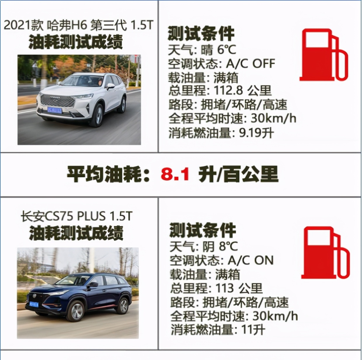 在节目中还进行了油耗测试。行驶了112.8KM,测试条件是A/C OFF,冬季气温比较低,平均速度是30km/h,因为驾驶员操作习惯不同,所以在测试中,采用了轮换驾驶的方式,以确保缩小这种差异,最终,长安的油耗是9.0L/100km,第三代哈弗H6是8.1L/100km,那么这一问题的答案显而易见了。