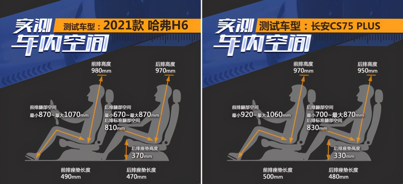 第三代哈弗H6尺寸为4653*1886*1730mm,轴距长达2738mm,而长安CS75 PLUS的尺寸为4690*1865*1710mm,轴距为2710mm。同时如图所示,第三代哈弗H6乘坐空间更为宽敞,可调节范围也更大,对孙泽来说更满足他的需求。