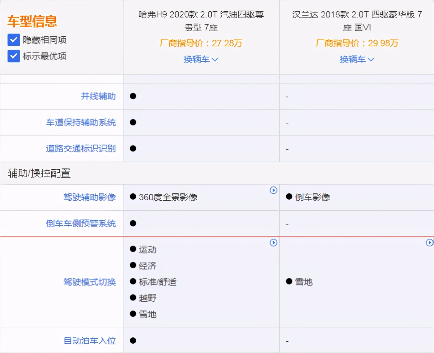 相比普通的5座SUV,7座SUV的价格往往会更高,因此产品的性价比十分重要。哈弗H9(2020款,2.0T四驱尊贵型)的官方指导价格为27.28万元,当前购车可享受至高3.3万元的综合优惠,涵盖置换补贴至高11000元、金融补贴至高15000元,限时优惠5000元以及2000元迎新礼包,价格进一步下探;汉兰达(2018款,2.0T四驱豪华版)的官方指导价格为29.98万元,官方暂时没有任何优惠政策。
