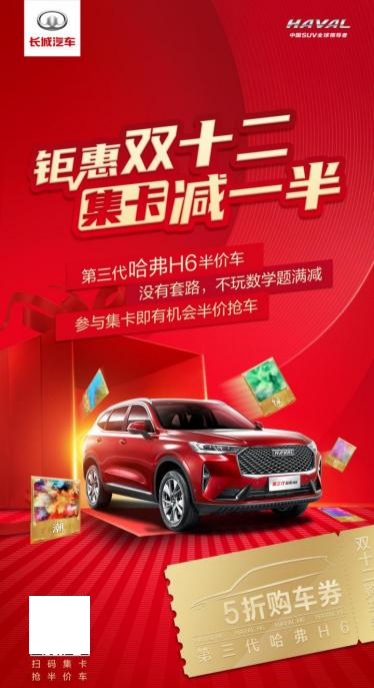 此外,还有大波年终福利正在派发,第三代哈弗H6开启“集卡大作战、半价赢新车”活动,优惠力度爆表!