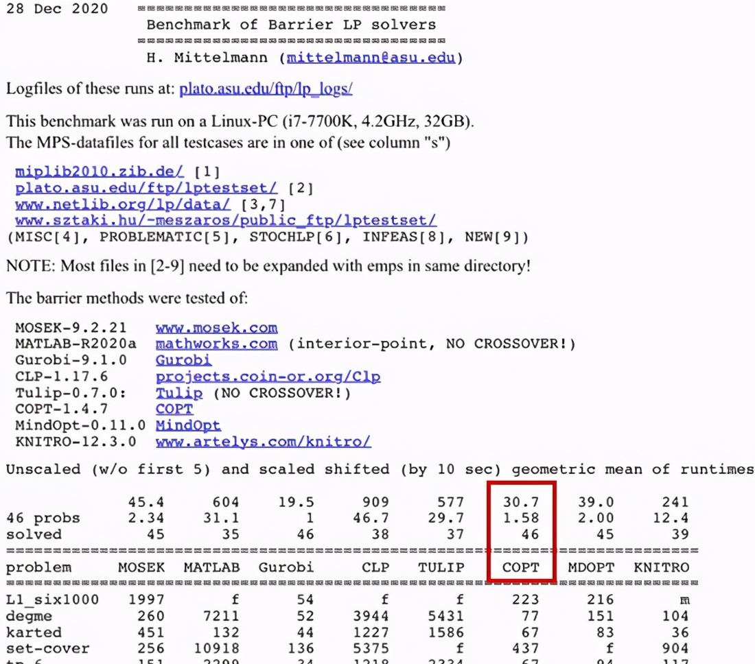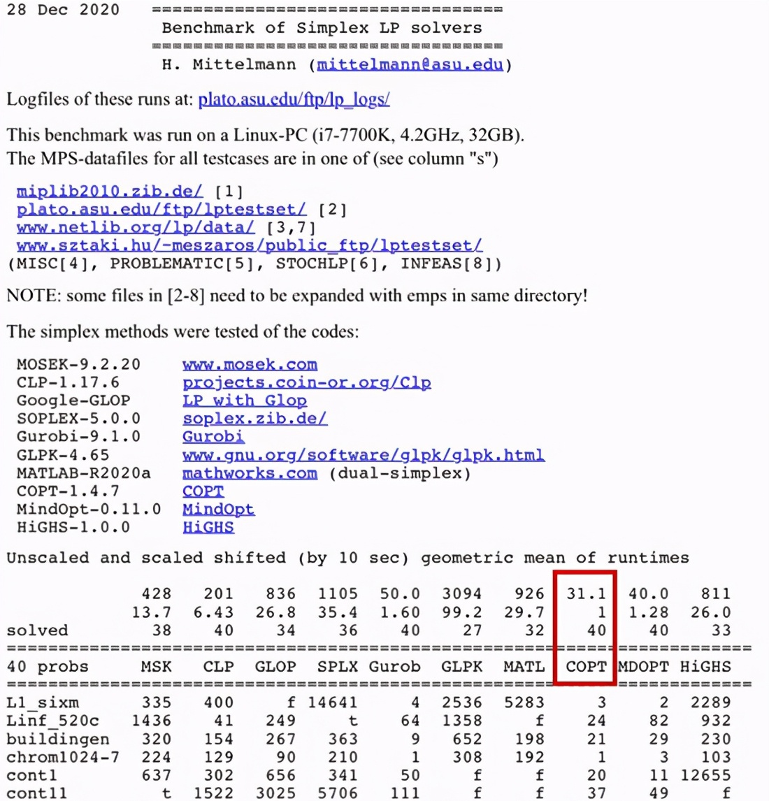 图一: COPT在Mittelmann线性规划单纯形法榜单继续全球第一