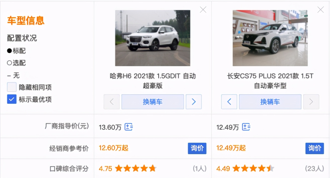 第二代哈弗H6让用户的每一分钱都花在刀刃上,力求做到“买得安心”。我们和同级竞品长安CS75 PLUS相比较一下,以13万预算为参考标准,选取了两款车型,从下图中即可知二者差距。