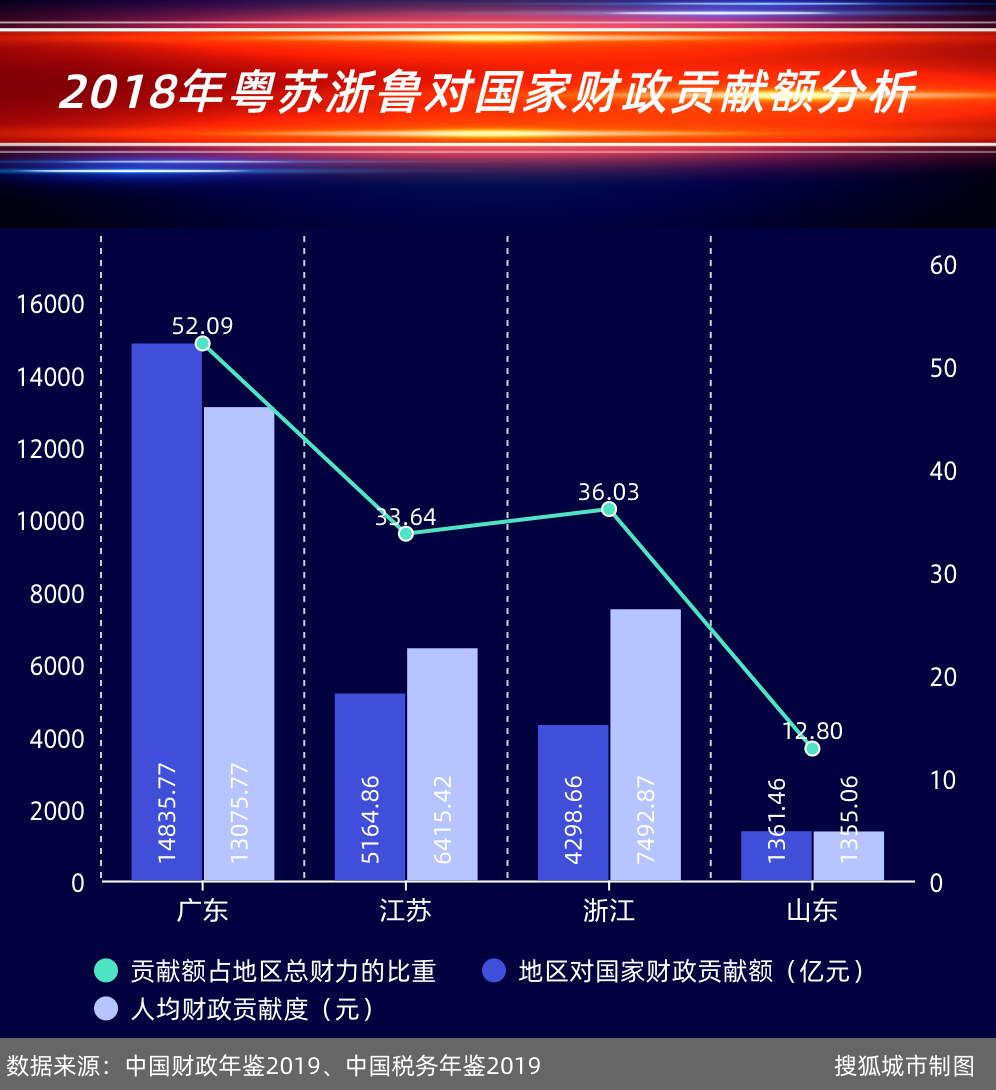 中国是典型的分税制。根据搜狐城市梳理的数据,2018年,广东创造的总财力高达2.8万亿,而地方可支配财力只有1.36万亿,净贡献1.48万亿,分别是同期江苏、浙江、山东三省的2.04、1.75、9.65倍。
