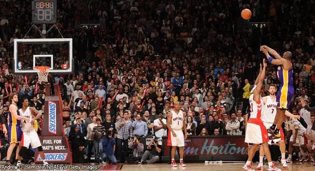 2010年3月9日,斯台普斯球馆。刚刚三连败的湖人,被多伦多猛龙逼到了最后时刻。克里斯·波什一记三分将分数追到107平,给科比留了9.5秒。两天前在奥兰多,科比刚投失一记绝杀。