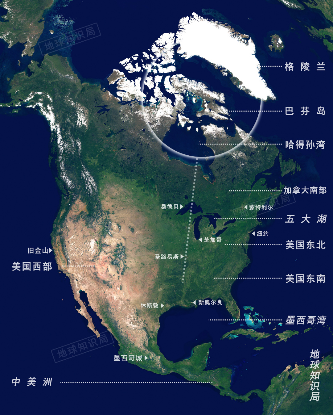 西半球的北极冷涡中心巴芬岛位于加拿大东北部。这里与美国之间仅有哈得孙湾、哈得孙沿岸平原与五大湖相隔,地势一马平川,并不能有效阻碍寒潮南下。