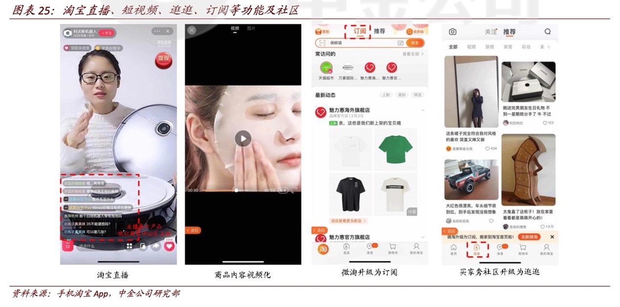 以淘宝为例,阿里正在强调内容化、社区化属性淘宝的内容化,不是说淘宝要回过头往社区或媒体的方向走,而是淘宝去加强内容化功能属性,强化淘宝直播、短视频等内容形态工具,进一步孵化培养逛逛、订阅等内容社区,培养消费者更深度、更沉浸式的购物方式,改善用户留存,提升用户粘性。